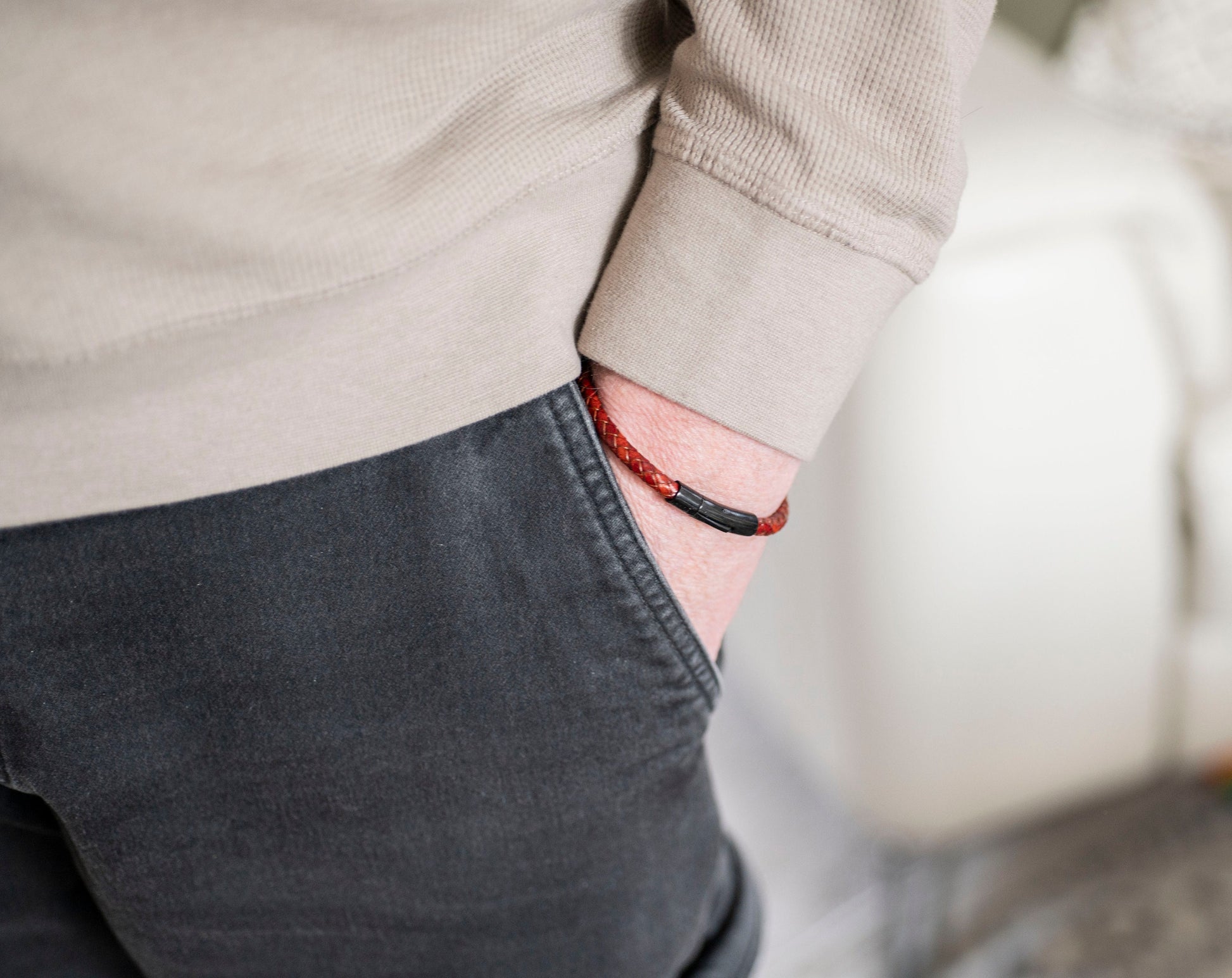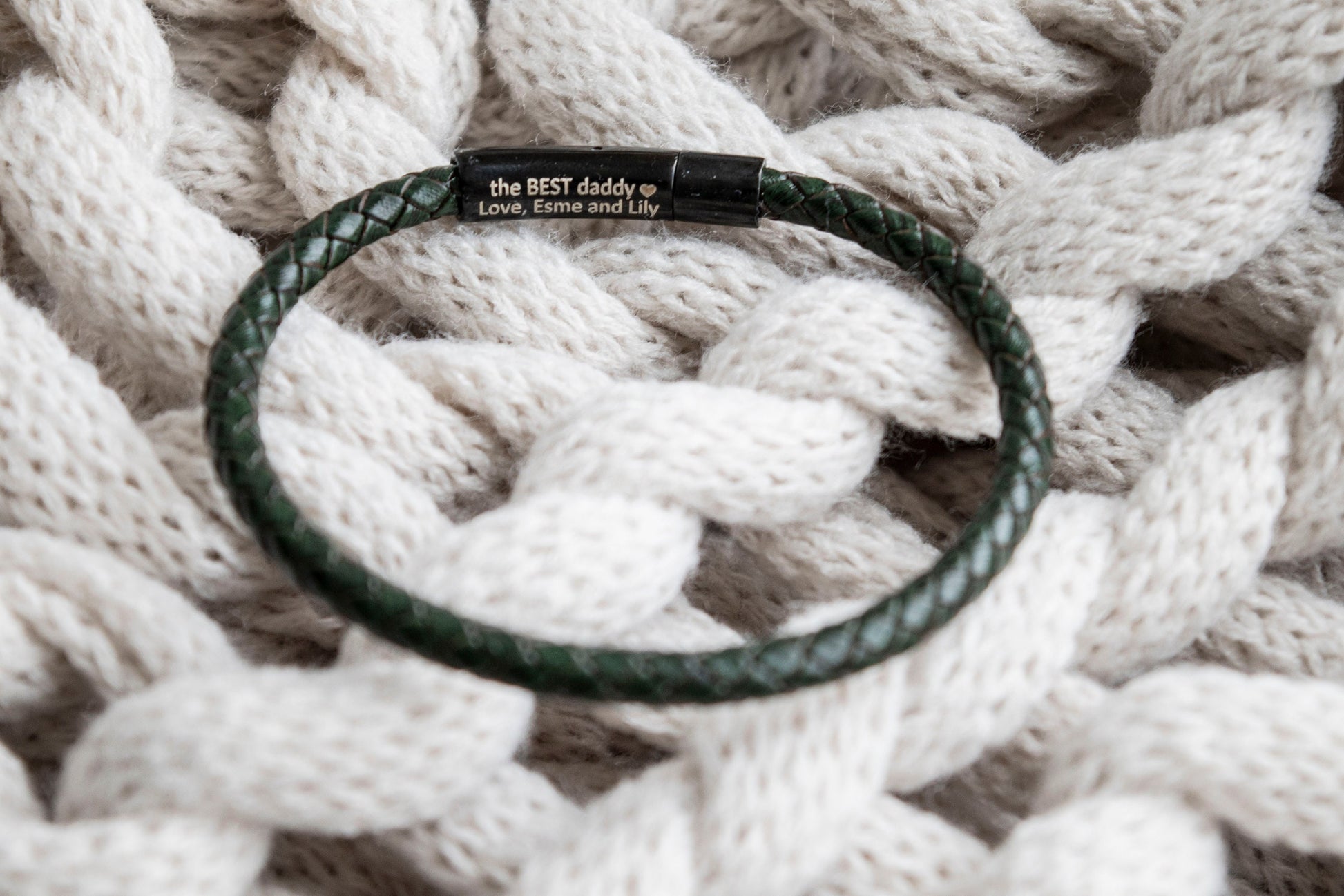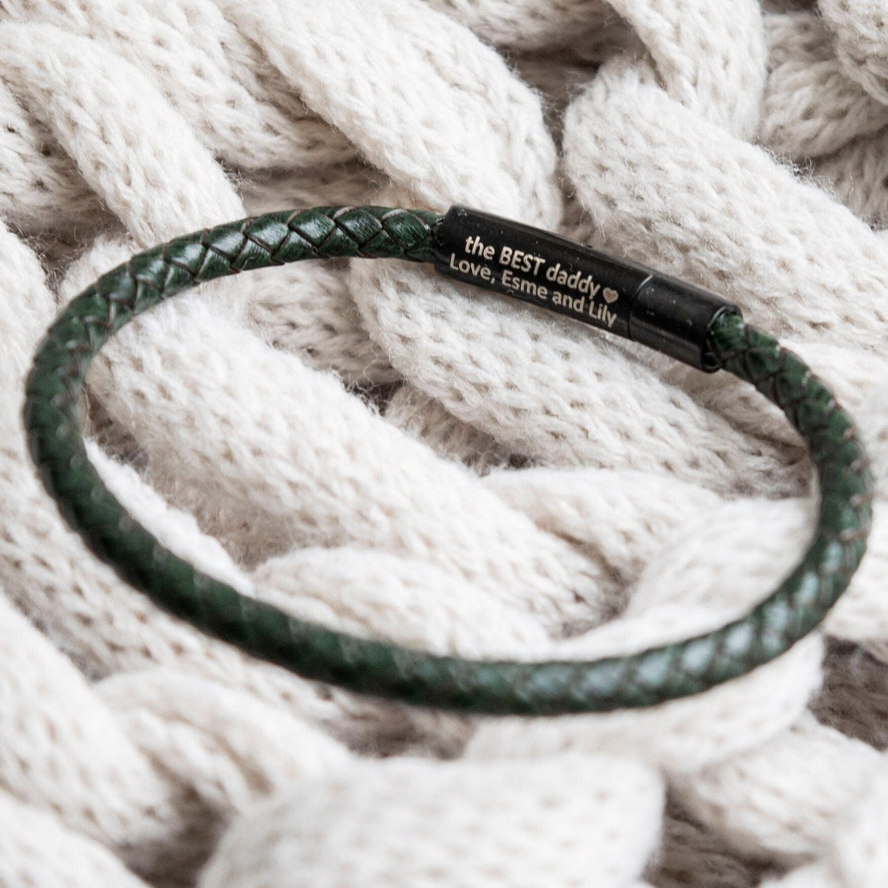 Available in in multiple lengths; 7 Inches 7.5 Inches 8 Inches 8.5 Inches 9 Inches A size chart and how to measure is available in the pictures. (in both CM and Inches) Please double check the required size as we are unable to accept returns on personalised items. Real leather bracelet All metal components used in this bracelet are stainless steel and therefor it is hypoallergenic and is tarnish resistant.