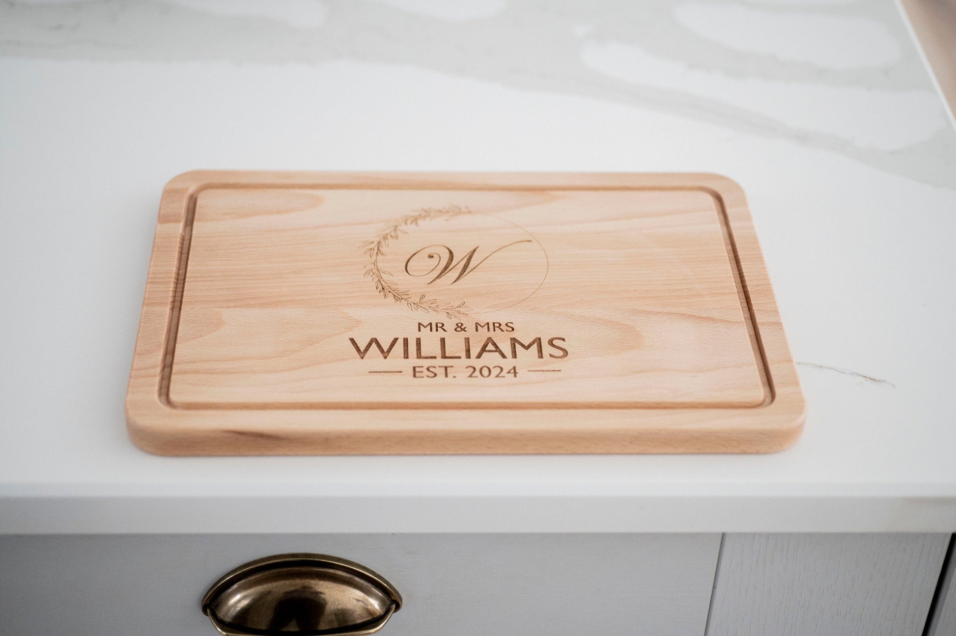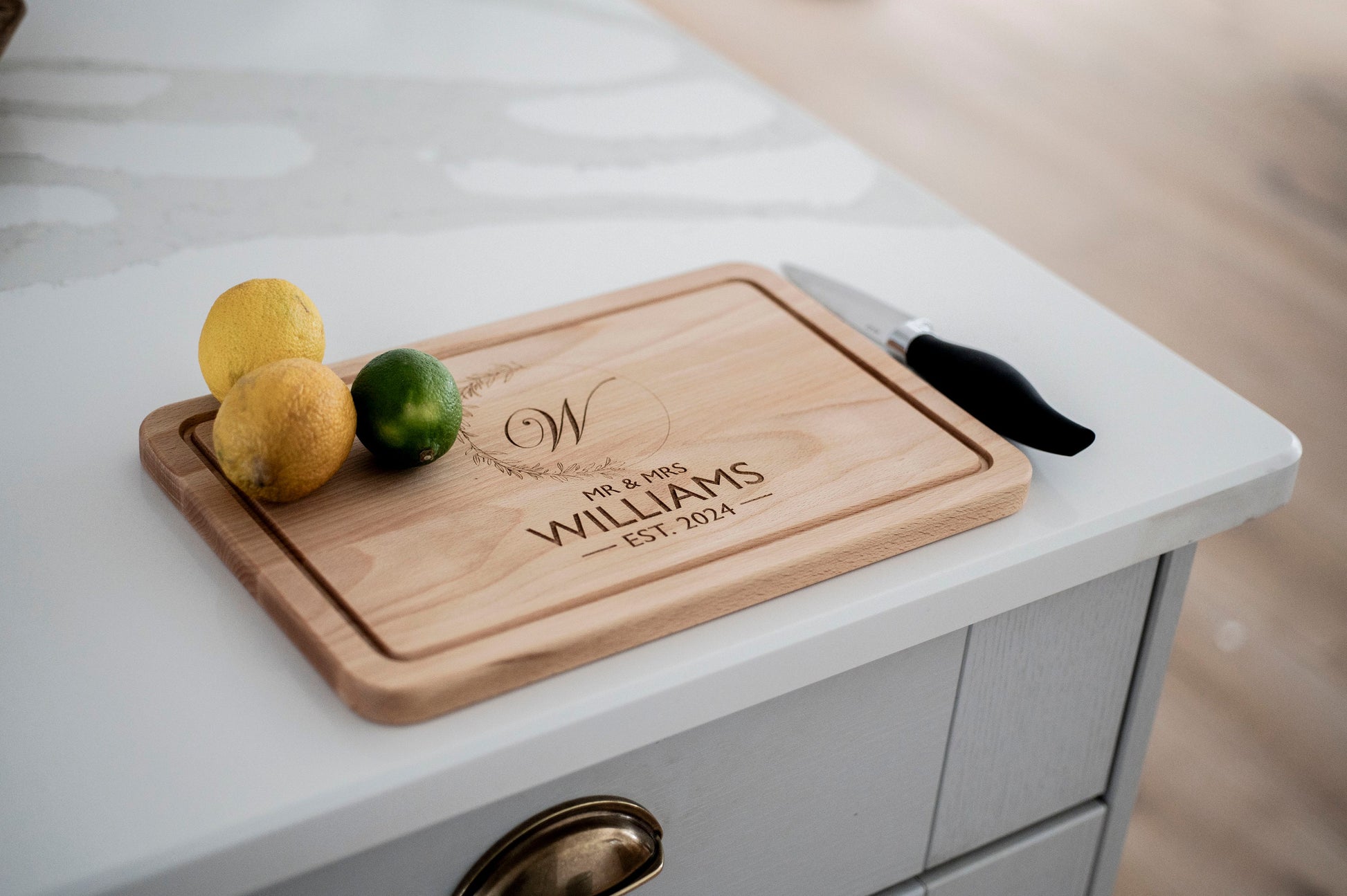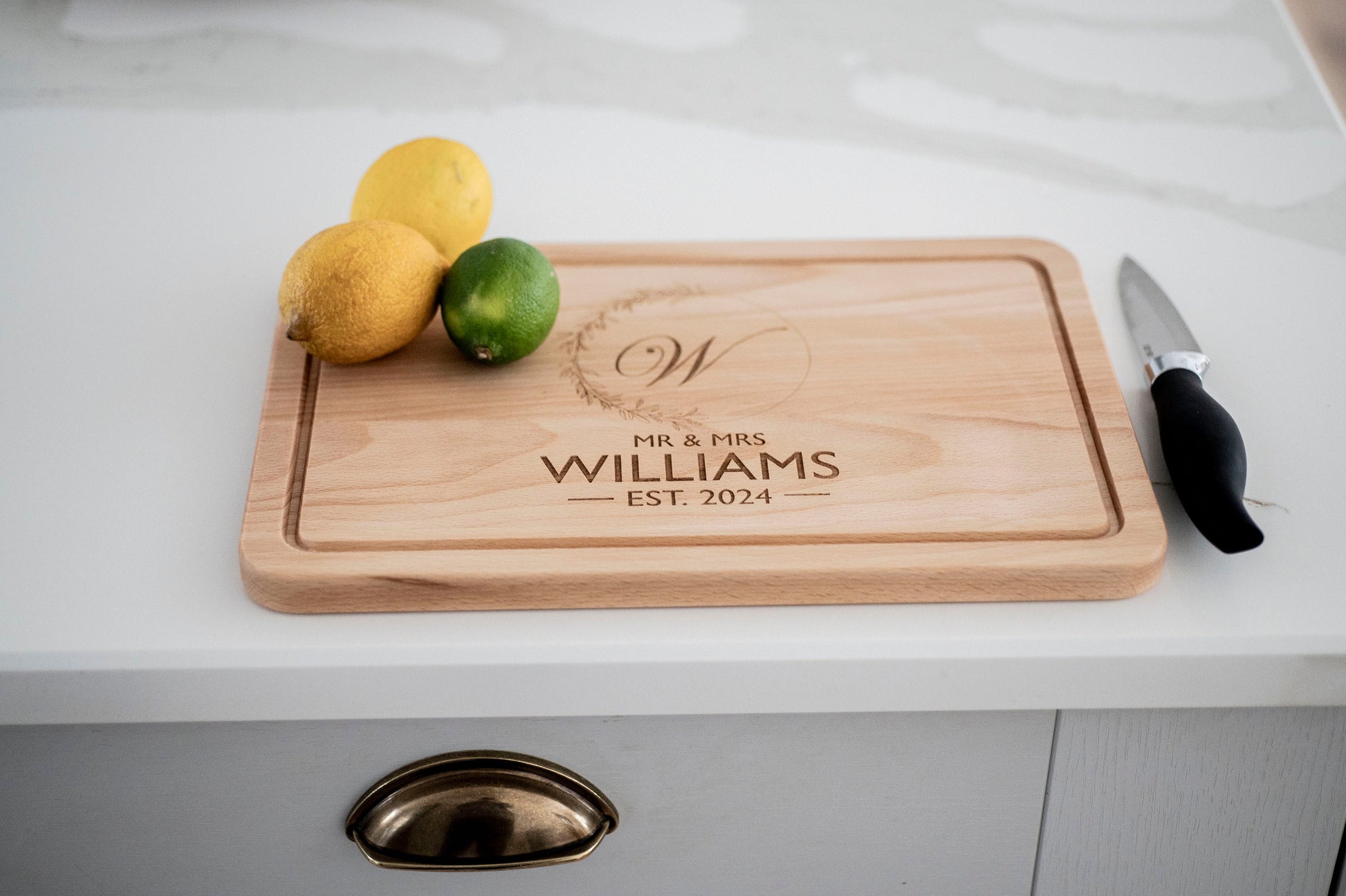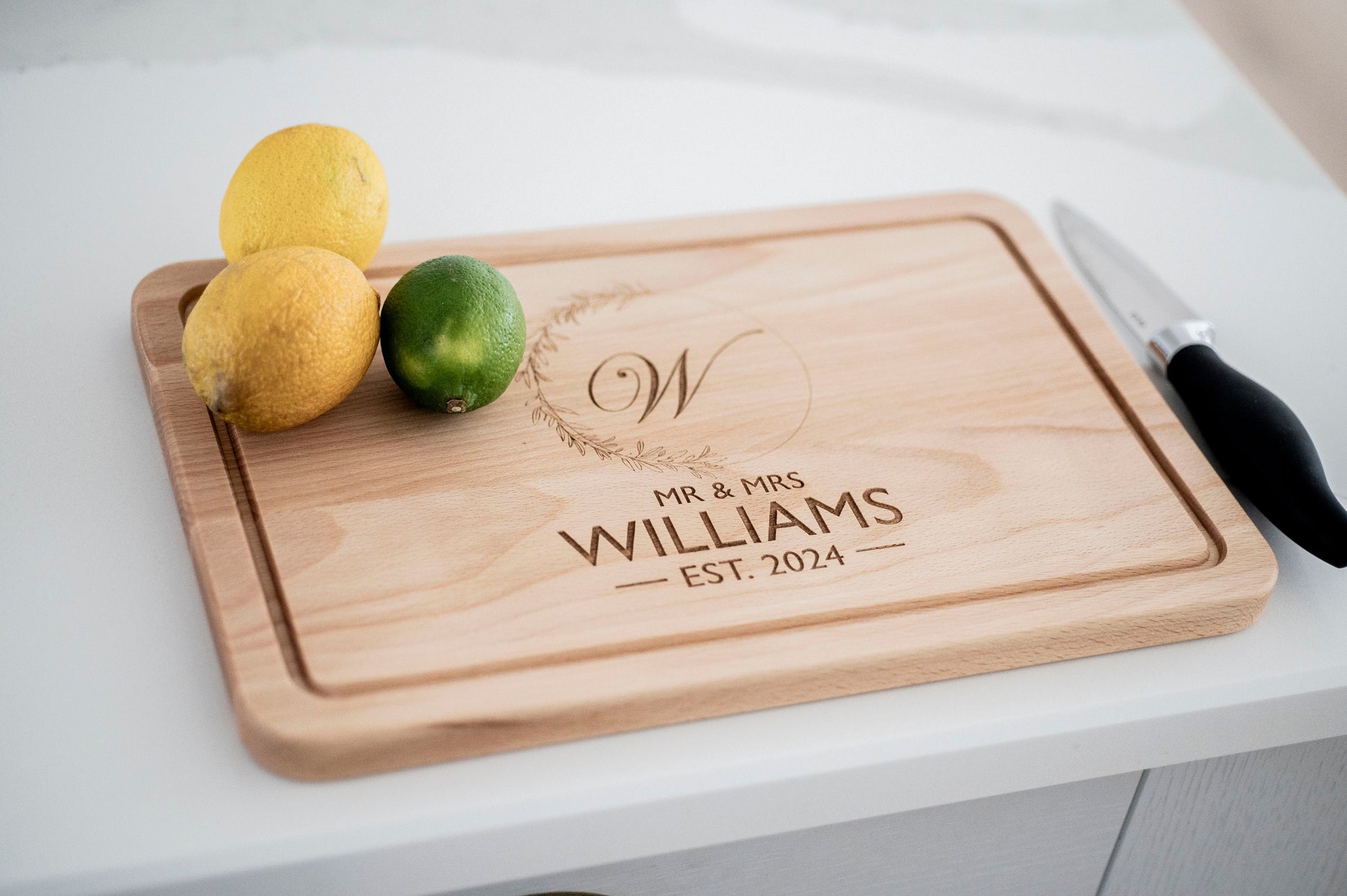 A Gorgeous personalised Wedding / Engagement gift. Item Details: Solid Beech wooden board, 30 x 20 cm (11.8 x 7.8 inches) Engraved for a long lasting finish. Finished with food safe mineral oil.