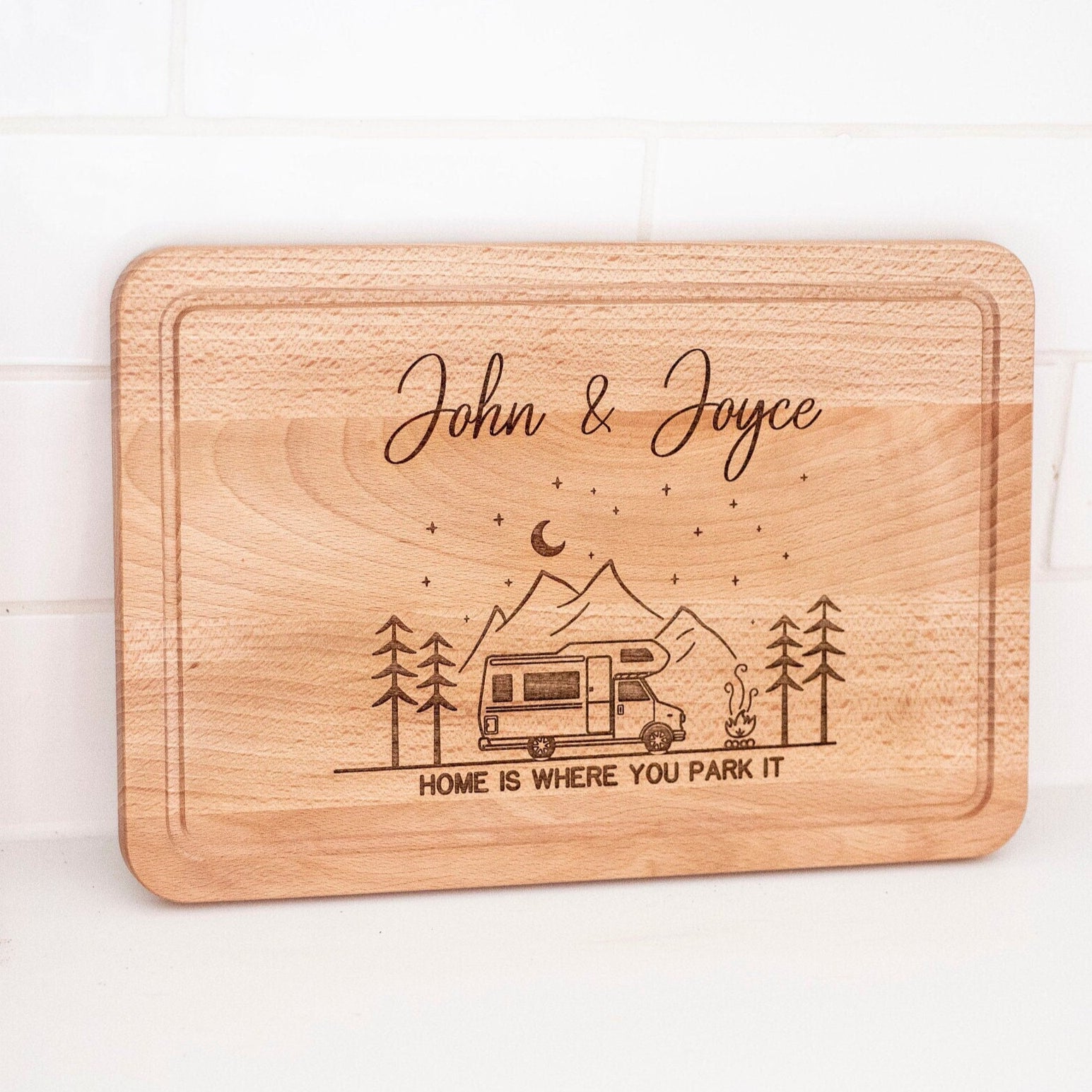 A Gorgeous personalised cutting / serving board, would make a amazing for that couple that is always out and about in their campervan.