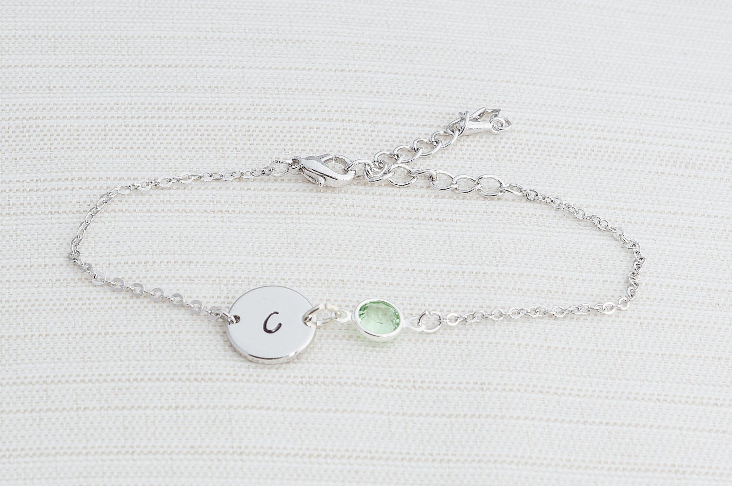 Details: - Materials used: Silver plated bracelet. 12mm (1/2 an inch) Silver plated disc, Swarovski elements birthstone.