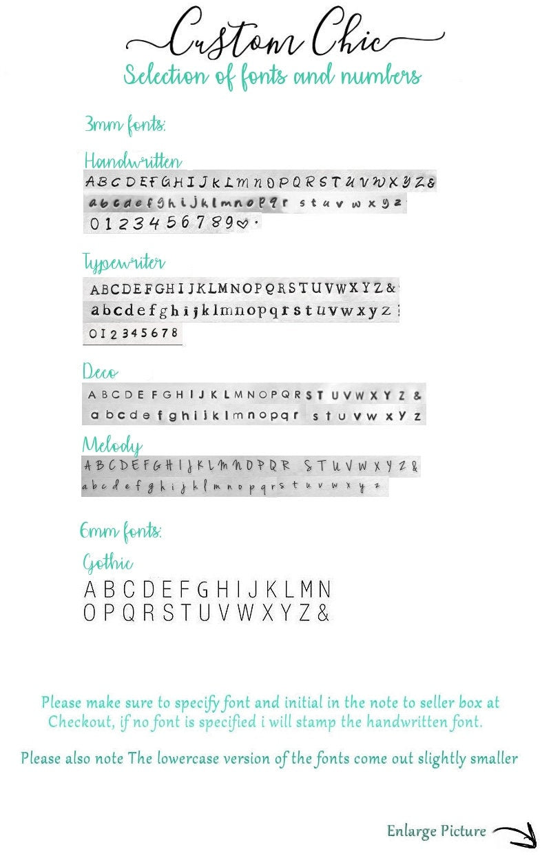 -Please see picture for example of the stamped letters, symbols and numbers, Max 2 initials or numbers per disc, 1 for the Gothic font.